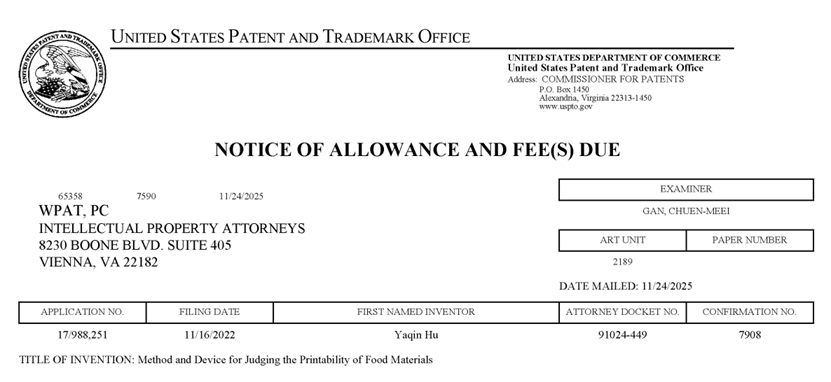 近日,胡亚芹教授领衔的科研团队在食品3D打印领域取得重大突破,其研发的“Method and device for judging the printability of food materials(一种评判食品物料可打印性的方法及装置)”正式获得美国专利商标局(USPTO)授权通知(美国专利号:US 17/988,251)。这是公司在食品智能制造与增材制造交叉领域获得的又一项重要国际性知识产权成果,标志着公司相关技术的创新性获得了国际认可。