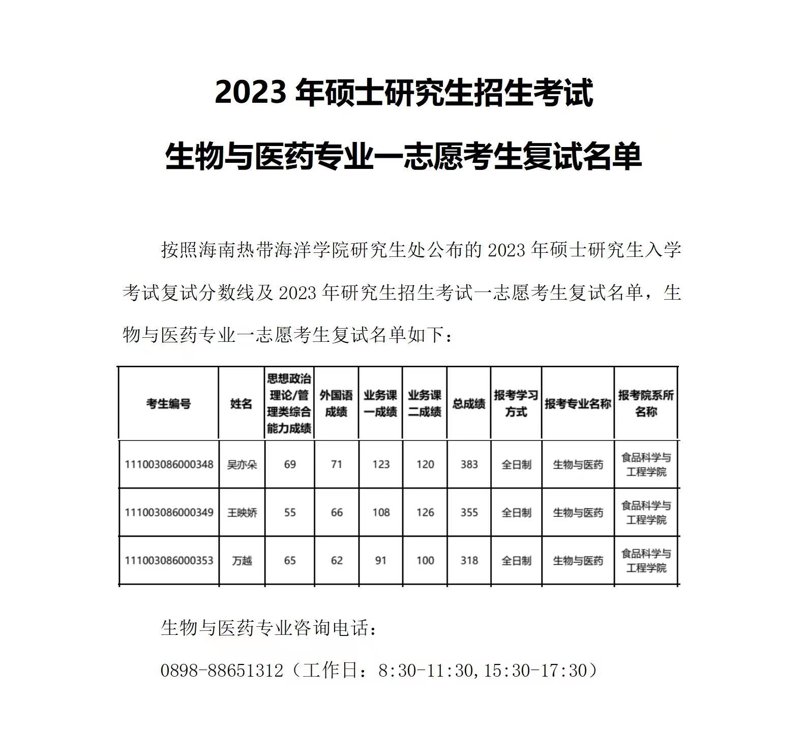 生物与医药专业一志愿考生复试名单